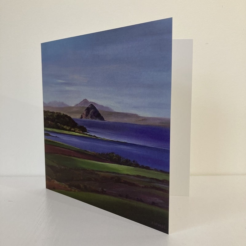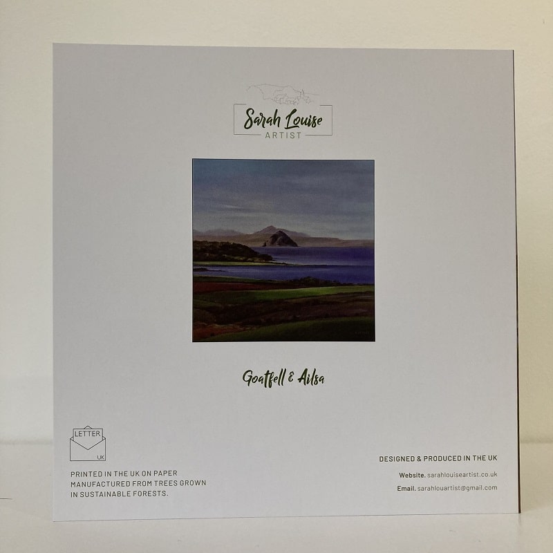 A 15cm x 15cm greetings card (blank inside) of Goatfell and Ailsa.