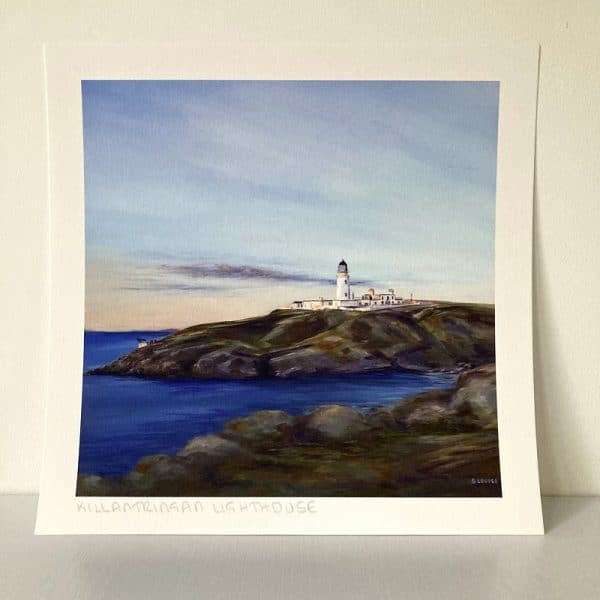 A 170mm x 170mm Giclée print of Killantringan Lighthouse on 200mm square textured card.
