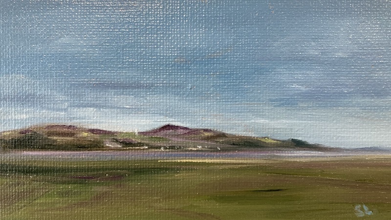 Painted in oil (water mixable) this one shows the local view across the saltmarshes of Wigtown Bay to Cairnharrow from the disused railway line.